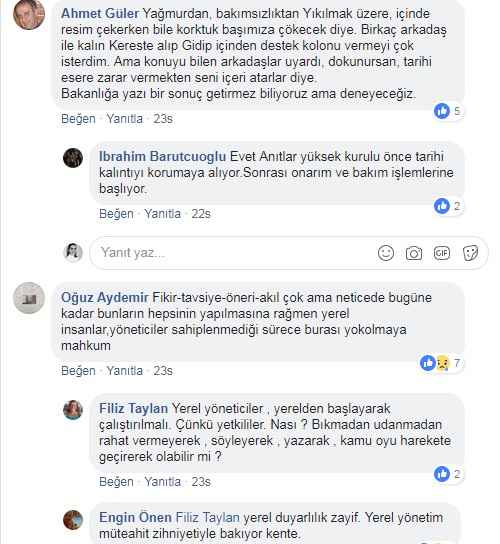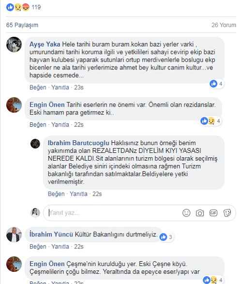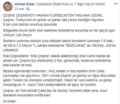 Dr. Ahmet Güler de haberhürriyeti.com’da yayınlanan “Yuh Olsun” başlıklı yazısında konuyla ilgili “İzmir ve Çeşme, ilk Türk amirali Çaka bey ile övünür, heykelini diker ama onun eserlerini korumakta sınıfta kalıyor. Yöre Türkiye’nin en gözde tatil merkezi özelliğini taşırken, 937 yıllık tarihini unutmuş durumda. Halen ayakta duran bir hamam ve cami kalıntısının yanı sıra geniş mezarlığıyla Anadolu’daki Türk varlığının en eski belgesi niteliğindeki eser ve eserler ilgisizliğe inat zamana direniyor” ifadelerini kullanırken Facebook üzerinden yaptığı paylaşım da çok sayıda yorum aldı.