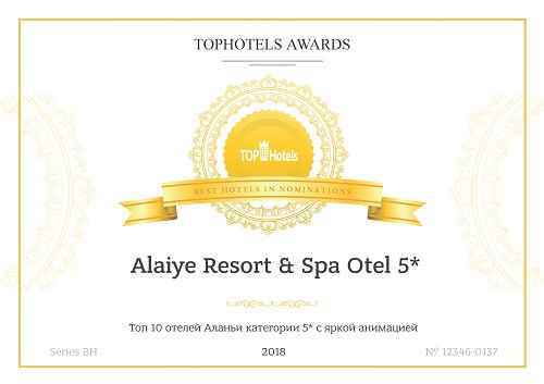 Misafir memnuniyeti odaklı çalışmasının karşılığı olarak Avrupa’nın en prestijli ödülü olan “2018 HolidayCheck En Çok Tavsiye Edilen Otel “ ödülüne layık görülen Alaiye Resort & Spa Hotel BDT (Rusya, Ukraine vb.) misafirlerinin tatile çıkmadan önce ziyaret ettiği ve tatil dönüşü konakladığı otellerini puanlayıp yorumladığı Tophotels.ru isimli siteden ise “En renkli Animasyon” ödülünü aldı.
