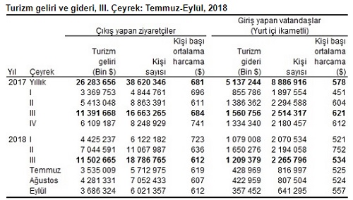 Ülkemizden çıkış yapan ziyaretçi sayısı 2018 yılı 3. çeyreğinde bir önceki yılın aynı çeyreğine göre yüzde 12,7 artarak 18 milyon 786 bin 765 kişi oldu. Bunların yüzde 84,7’sini 15 milyon 904 bin 734 kişi ile yabancılar, yüzde 15,3’ünü ise 2 milyon 882 bin 31 kişi ile yurt dışında ikamet eden vatandaşlar oluşturdu.