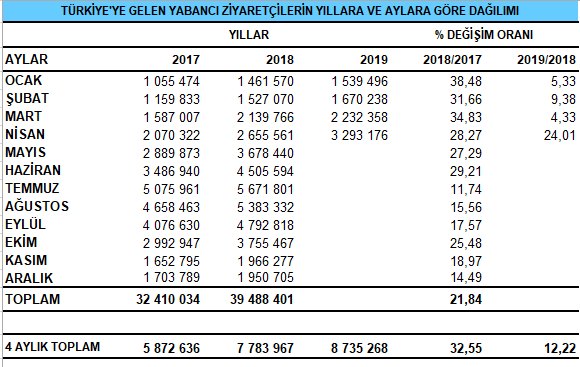 Turizmde 2019’un en yüksek artışının yaşandığı Nisan ayında Türkiye’yi 3 milyon 293 bin 176 yabancı ziyaretçi ziyaret etti.
