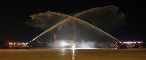 Bu hattaki ilk uçuşunu gerçekleştirerek Adana Havalimanı’na inen Corendon uçağı su takıyla ıslatılarak karşılandı.