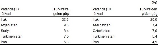 Türkiye’den göç eden yabancı uyruklu nüfusun içerisinde ilk sırayı % 20.6 ile yine Irak vatandaşları aldı. Bunu sırasıyla % 7.4 ile Azerbaycan, % 7 ile Özbekistan, % 5.4 ile Türkmenistan ve % 4.9 ile İran vatandaşları takip etti.