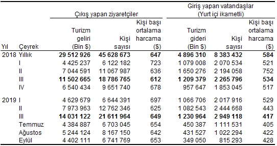 Turizm geliri 2019 yılının Temmuz, Ağustos ve Eylül aylarından oluşan III. çeyrekte bir önceki yılın aynı çeyreğine göre % 22 artarak 14 milyar 31 milyon 122 bin $ oldu.
