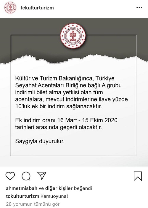 “Kültür ve Turizm Bakanlığınca, Türkiye Seyahat Acentaları Birliğine bağlı A grubu indirimli bilet alma yetkisi olan tüm acentalara, mevcut indirimlerine ilave yüzde 10’luk ek bir indirim sağlanacaktır.