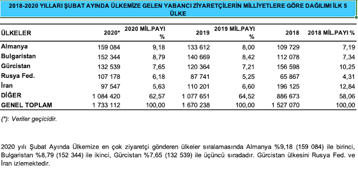 Şubat ayı ziyaretçi rakamlarında Gürcistan’ı ise Rusya Federasyonu ve İran izledi.
