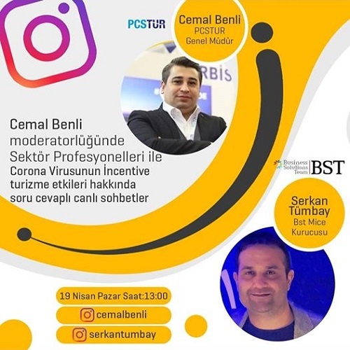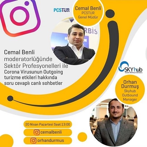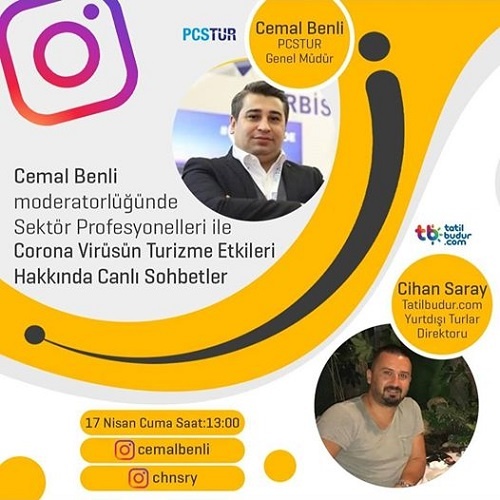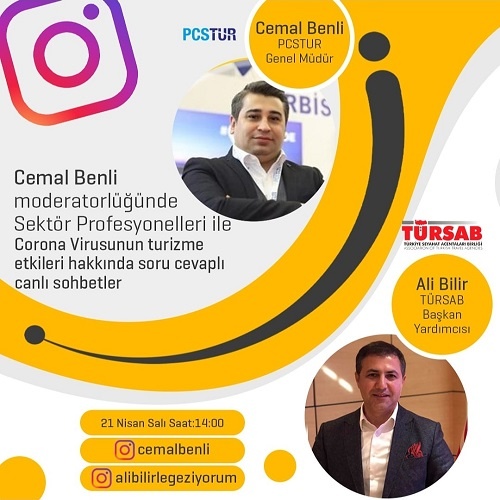 Coronavirus sebebiyle şu günlerde sosyal medya ve dijital platformlara artan yoğun ilgi, turizmcileri de etkisi altına aldı. Güncel haber, çeşitli bilgi paylaşımları ve tartışmalarla zamanlarını geçirmek isteyen turizmciler, evde devam eden karantina haline sektör bazında yeni bir boyut getirdi. Turizmde pandemi sonrasını konuşabilmek için 30 dakikalık canlı söyleşiler yapılmaya başlandı. Bunun ilki 15 Nisan Çarşamba günü ‘BizBize / Profesyonel Sohbetler’ programı ile gerçekleşti. Turizmci Erkan Savaş moderatörlüğünde yapılan programın ilk konuğu PCS Turizm Genel Müdürü Cemal Benli oldu. Benli, bu programa konuk olmasının ardından kendi Instagram hesabı üzerinden de sektör profesyonelleri ile “Corona virüsün turizme etkileri hakkında canlı sohbetler” ana başlıklı yayınlar gerçekleştireceğini duyurdu. İşte Benli’nin gerçekleştireceği instagram canlı yayınlarının detayları: