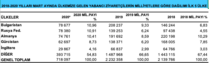 Kültür ve Turizm Bakanlığı’nın açıkladığı verilere göre, 2020 yılının Mart ayında ülkemize 718 bin 97 yabancı ziyaretçi geldi.