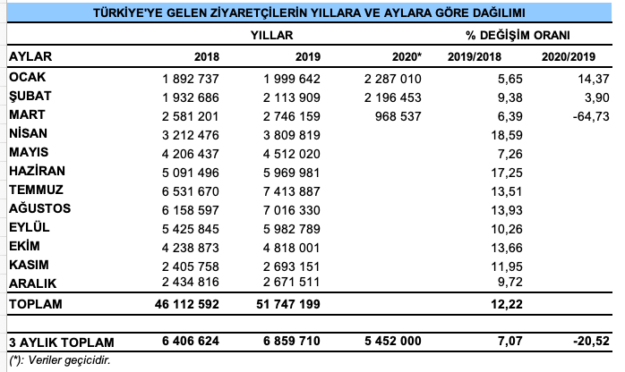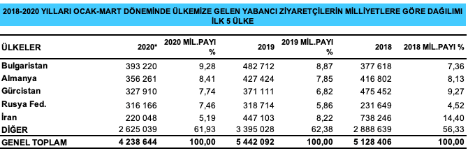 2020 yılı Ocak-Mart döneminde ülkemizi ziyaret eden yabancı sayısı 4 milyon 238 bin 644 oldu.