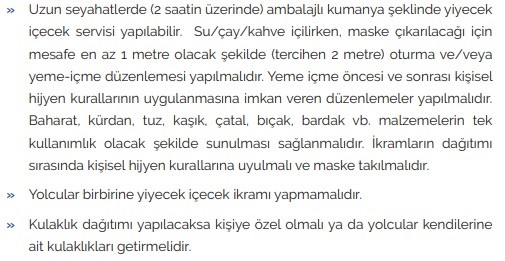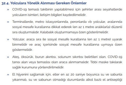 COVID-19 / Salgın Yönetimi ve Çalışma Rehberi’nde “Karayolu, Demiryolu ve Deniz Taşımacılığı ile ilgili alınması gereken önlemler” başlıklı kurallarda “Yolculara yönelik alınması gereken önlemler” ise şöyle belirtildi: