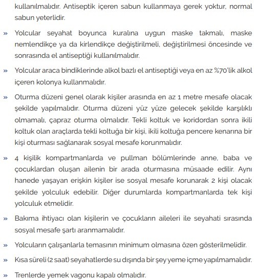COVID-19 / Salgın Yönetimi ve Çalışma Rehberi’nde “Karayolu, Demiryolu ve Deniz Taşımacılığı ile ilgili alınması gereken önlemler” başlıklı kurallarda “Yolculara yönelik alınması gereken önlemler” ise şöyle belirtildi: