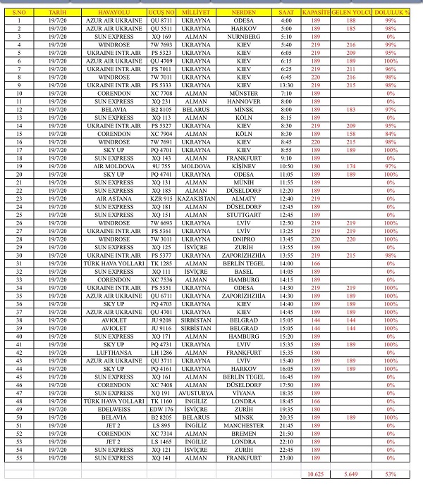 9 ÜLKEDEN TOPLAM 55 UÇUŞ İLE ANTALYA’YA GELENLERİN TABLOSU