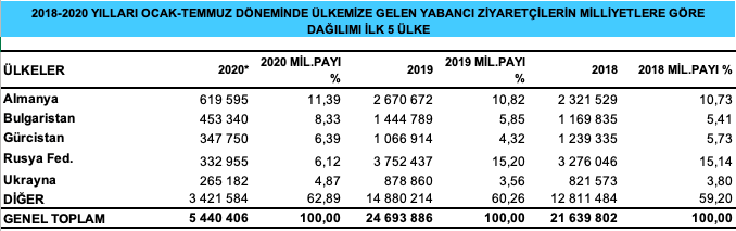 2020 yılı Ocak – Temmuz döneminde ülkemize en çok ziyaretçi gönderen ülke sıralamasında Almanya %11.39 (619 bin 595) ile birinci, Bulgaristan %8.33 (453 bin 340) ile ikinci, Gürcistan %6.39 (347 bin 750) ile üçüncü sırada yer aldı. İlk yedi aylık dönemde Gürcistan’ı Rusya ve Ukrayna izledi.