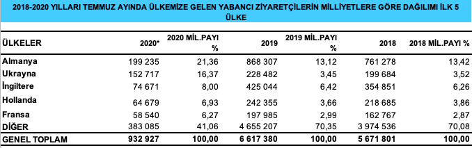 2020 yılı Temmuz ayında ülkemize en çok ziyaretçi gönderen ülkeler sıralamasında Almanya %21.36 (199 bin 235) ile birinci, Ukrayna %16.37 (152 bin 717) ile ikinci, İngiltere (Birleşik Krallık) %8 (74 bin 671) ile üçüncü sırada yer aldı. İngiltere’yi Hollanda ve Fransa izledi.