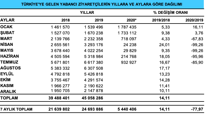 2020 yılı Ocak-Temmuz döneminde ise ülkemizi ziyaret eden yabancı sayısında geçen yılın aynı dönemine göre %77.97 azalma yaşandı.