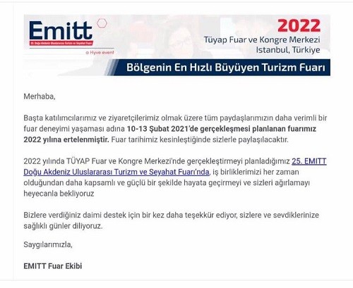 10-13 Şubat 2021’de gerçekleşmesi planlanan Doğu Akdeniz Uluslararası Turizm ve Seyahat Fuarı (EMITT) 9 – 12 Şubat 2022’ye ertelendi.