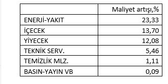 Buna göre otellerde maliyet artışlarında % 23’ten fazla yükselen “enerji” grubu, esas sürükleyici oldu.