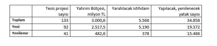 - Ocak-ağustos dönemi bulgularına göre toplam 133 tesis ve otel projesi için 3 milyar TL dolayında yatırım bütçesi ayrıldı.