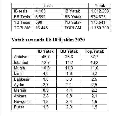 Türkiye turizminin; İşletme Belgeli ve Belediye Belgeli otellerinde sahip olduğu yatak sayısı, 2020 yılı ekim ayında 1,58 milyonu geçti. Yatırımda olan oteller de dikkate alındığında; önümüzdeki 5-6 yıl içinde, Türkiye toplamda 1,76 milyon yatak kapasitesine ulaşmış olacak. Yatak arzının büyük kısmını elinde tutan Antalya, liderliğini sürdürüyor.
