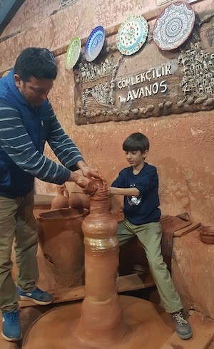diye anlattığı Avanos’a varıyoruz. Kazların ve ördeklerin rahatça yüzdüğü Kızılırmak’ın kıyısında keyifli bir yürüyüş yapıp, sallanan köprü ile Avanos’un diğer yakasına geçip; çömlek atölyesine geçiyoruz.