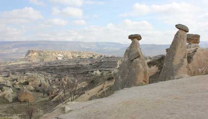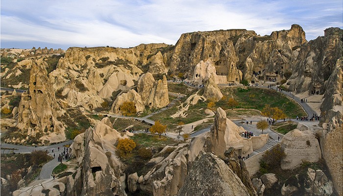 Üç Güzeller peri bacaları ardından her biri doğal volkanik tüf oluşumu olan ve insanoğlu tarafından oyularak, kazılarak savunma ve sığınma yeri olarak kullanılmış olan Ortahisar ve Uçhisar Kaleleri’ni görüp Göreme Açık Hava Müzesi’ne geçiyoruz.