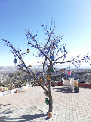 Bir yanda Uçhisar Kalesi bir yanda Güvercinlik Vadisi, ve o meşhur nazar boncuklu ağaç. Karşımızda insan eli ile yapılmış güvercin yuvaları var. Güvercin yuvaları yapmışlar ki güvercinlerin etinden, gübresinden ve yumurtasından (şapellere freskleri yapmak için) faydalanabilsinler. Artık sadece 30/35 çift kalmış olsa da güvercinler kanatlandığın da gökyüzünde büyüleyici bir manzara oluşturuyorlar.