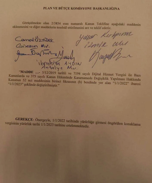 Önergeyle 1 Ocak 2022 tarihinde yürürlüğe girmesi öngörülen konaklama vergisinin yürürlük tarihi 1 Ocak 2023 tarihine ertelenecek.