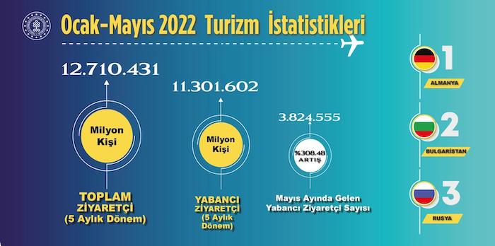 Türkiye, 2022 yılının ilk 5 aylık döneminde toplam 12 milyon 710 bin 431 ziyaretçiyi ağırladı.