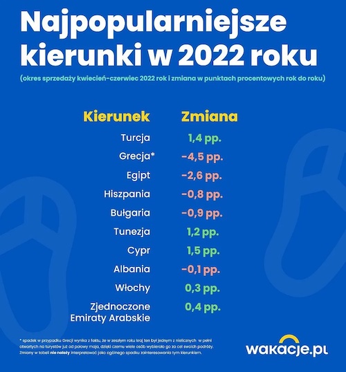 Polonya’nın önde gelen online seyahat acentası wakacje.pl’nin paylaştığı araştırma sonuçlarına göre 2022 yılının ikinci çeyreğinde en (Nisan – Mayıs – Haziran) popüler destinasyonlar Türkiye, Yunanistan ve Mısır oldu.