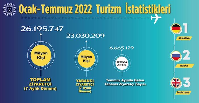 Türkiye bu yılın ilk 7 ayında toplam 26 milyon 195 bin 747 ziyaretçi ağırladı. Almanya, Rusya Federasyonu ve İngiltere sırasıyla en çok ziyaretçi gönderen ülkeler oldu.          Temmuz 2022 ziyaretçi rakamları