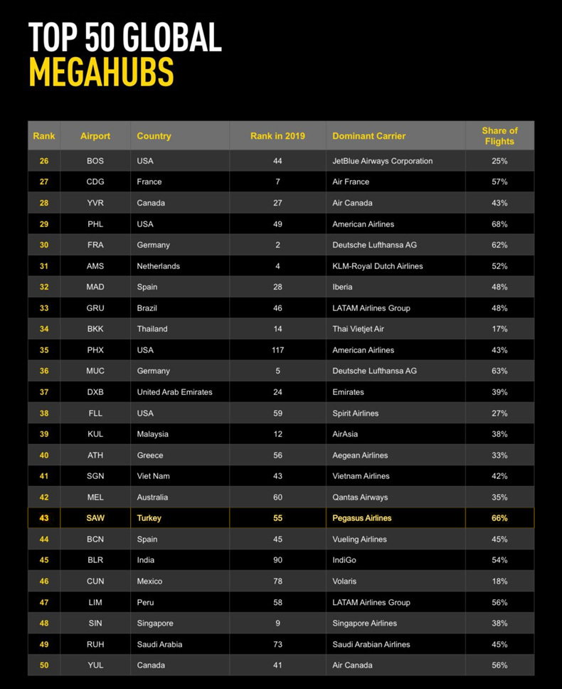 Megahubs Endeksi, dünyanın önde gelen havacılık verileri ve analitiği sağlayıcısı olan OAG tarafından derlendi.