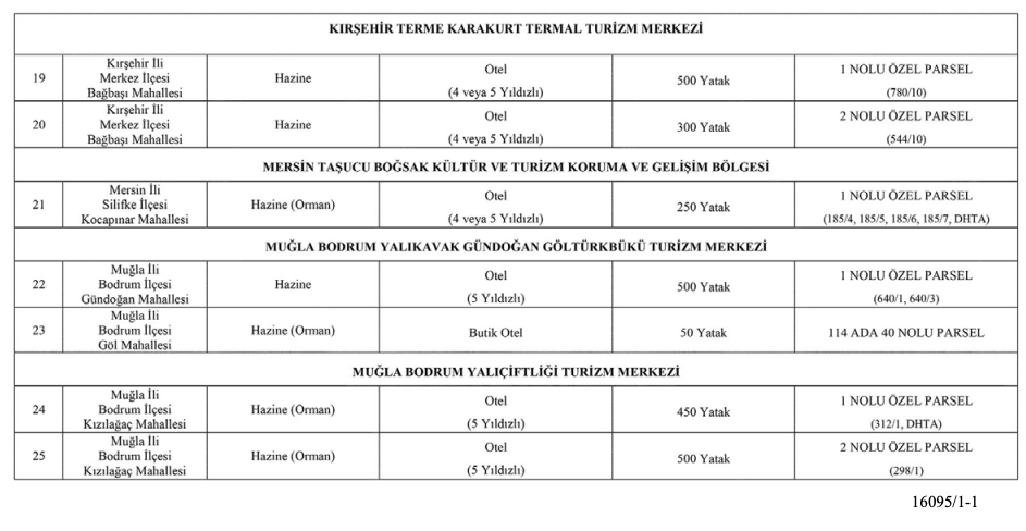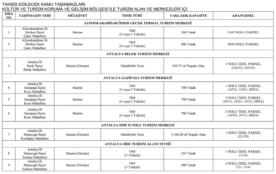 Turizm yatırımlarına tahsis edilecek taşınmazlar; Afyonkarahisar, Antalya, Denizli, Erzincan, Hatay, İzmir, Kırşehir, Mersin ve Muğla illerinde yer alıyor.