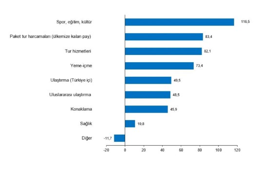 Bu çeyrekte geçen yılın aynı çeyreğine göre spor, eğitim, kültür harcaması yüzde 116,5, paket tur harcamaları (ülkemize kalan pay) yüzde 83,4, tur hizmetleri harcaması yüzde 82,1 arttı.