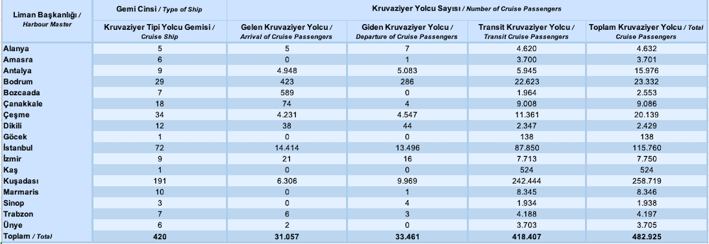 Yolcu trafiği açısından en yoğun limanlar ise Kuşadası (258 bin 719 yolcu), İstanbul Galataport (115 bin 760 yolcu) ve Bodrum Limanı (23 bin 332 yolcu / 29 gemi) oldu.